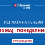 Министерството за труд и социјална политика известува на ден 30.05.2022 год. (понеделник) започнува етапната исплата на мајските пензии, кои продолжуваат да се исплатуваат предвремено.