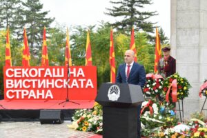 „На ова свето место, Спомен-костурница во Куманово, вечниот дом на околу 300 борци кои своите животи ги положиле во темелите на родната земја, оддаваме искрена почит кон сите борци во антифашистичката и народноослободителна борба и ја испраќаме пораката дека светиот аманет да се биде на вистинската страна е примен, чуван, реализиран и ќе биде предаден на идните генерации, како отсекогаш, во името на добрата иднина на Република Северна Македонија“, рече Ковачевски.