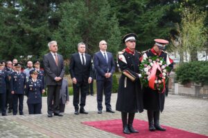 Со посебен пиетет положив свежо цвеќе на спомен обележјето на загинатите македонски херои, полициските службеници, Кирил Петрушевски и Ерол Готак, во кругот на ПС Гази Баба.