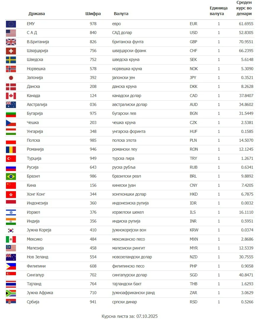 Курсна листа на Народната банка на Република Северна Македонија формирана на 06.10.2025 која се применува од 00:00 часот на 07.10.2025 година до почетокот на важење на новата Курсна листа: