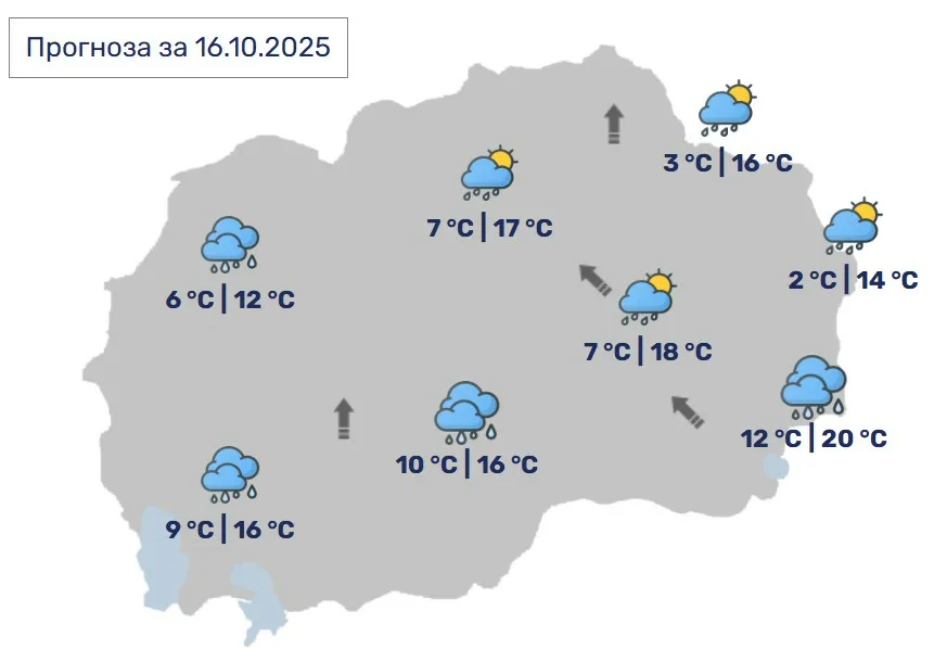 Променливо облачно со локални врнежи од дожд. Пообилни врнежи ќе има кон крајот на денот и во текот на ноќта. Ќе дува слаб до умерен ветер од југоисточен правец.