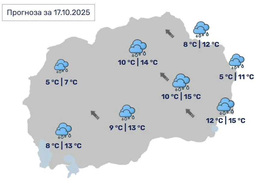 Во Скопје, претежно облачно со повремени врнежи од дожд, повремено пообилни. Ќе дува слаб до умерен ветер од југоисточен правец.
