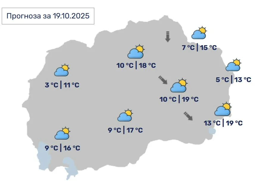Претпладне променливо облачно со сончеви периоди. Во западните планински региони ќе има услови за слаб дожд. Попладне облачноста ќе се намали. Ќе дува слаб, долж Повардарието умерен ветер од северен правец.
