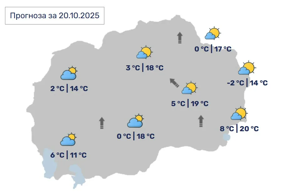 МЕТЕОCENTARМАКЕДОНИЈАСиноптичарите излегоа со најновата прогноза – Какво време да очекуваме? 10:47, октомври 20, 2025 Сончево со мала до умерена локална облачност. Ќе дува слаб до умерен ветер од јужен правец. Во Скопје, сончево со мала до умерена облачност. Ќе дува слаб до умерен ветер од југоисточен правец.