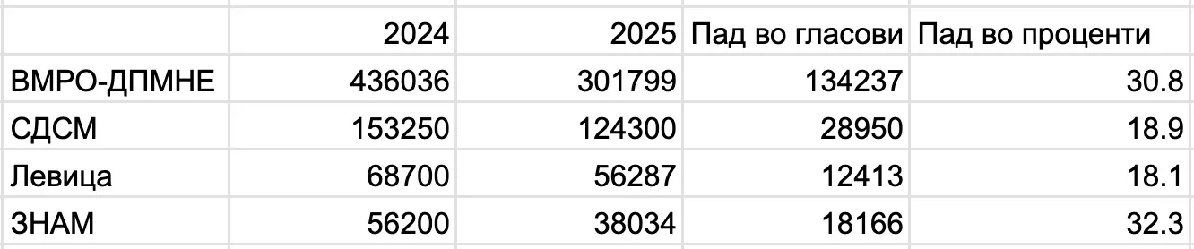 – Споредбените анализи со изборните резултати од минатата година покажуваат дека ВМРО–ДПМНЕ и ЗНАМ имаат изгубено по речиси една третина од гласовите. Падот на ВМРО-ДПМНЕ е фантастични 135.000 или 30,8% од гласовите, а ЗНАМ паѓа од 56.200 на 38.034 гласови, односно е најголем губитник и има изгубено 33% од гласовите.