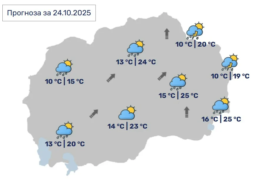 Во Скопје, променливо облачно, претпладне со повремен дожд, локално пороен. Ќе дува умерен, во делови од котлината повремено засилен ветер од јужен правец.