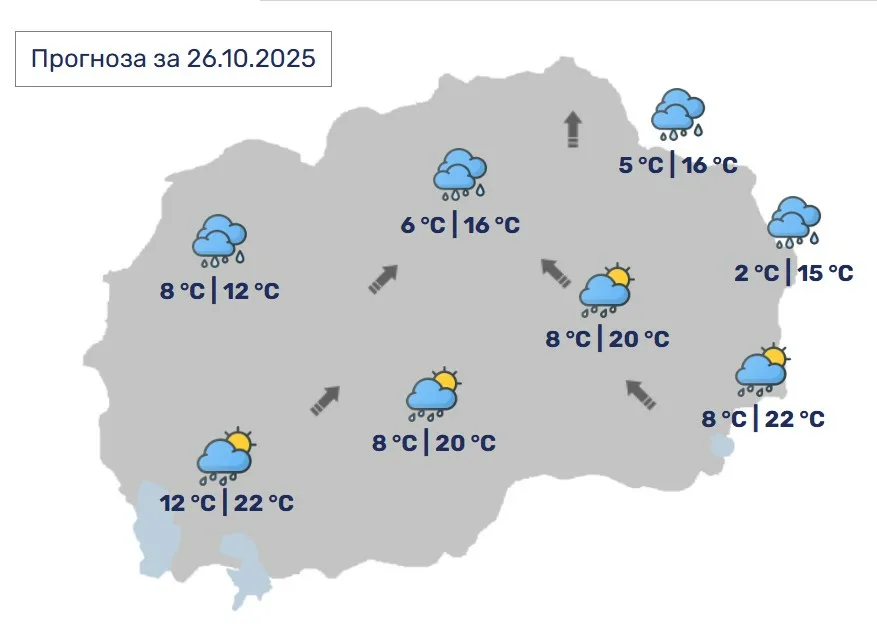 Во вторник ќе има локални врнежи од дожд со послаб интензитет, а потоа во следните денови времето ќе биде стабилно со благ пораст на дневните температури.