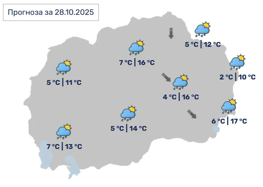 Променливо облачно со повремени локални врнежи од дожд. Ќе дува умерен, а долж Повардарието повремено засилен ветер од северозападен правец.