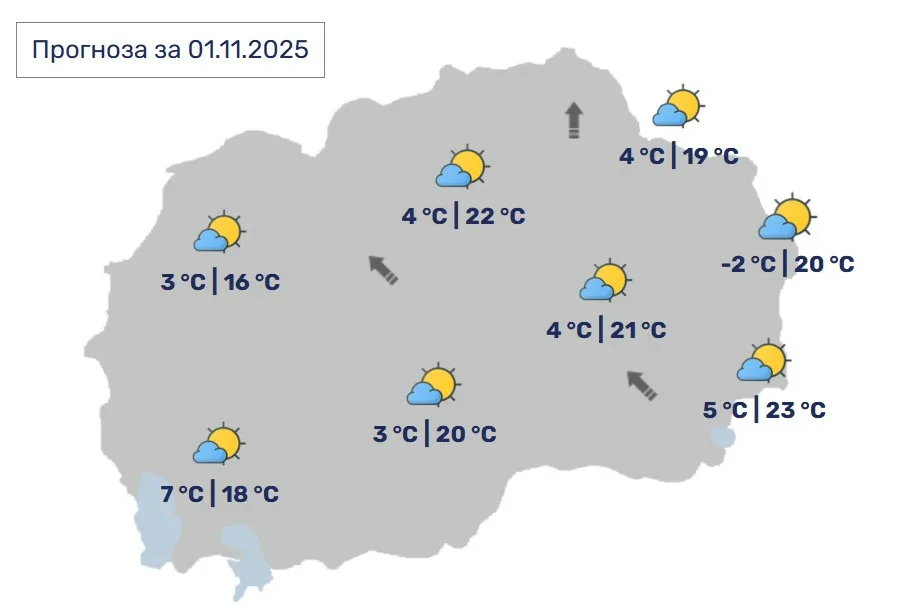 Времето и метеоролошките параметри за Скопје: Преку денот ќе биде сончево со мала до умерена облачност. Ќе дува слаб ветер од југоисточен правец.