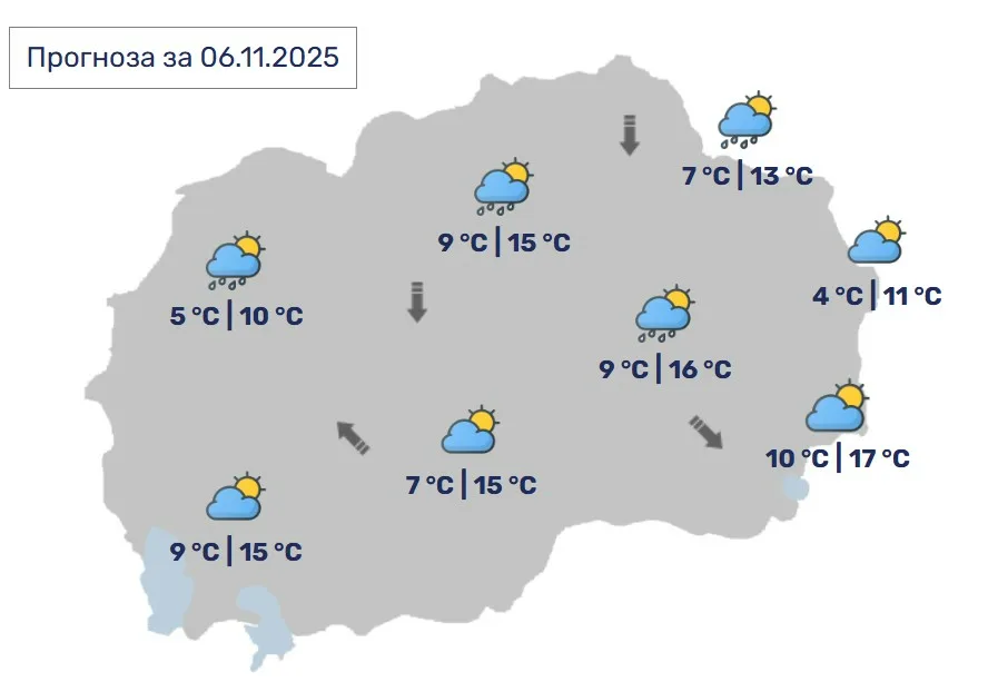Во Скопје, променливо облачно, во вечерните часови и во текот на ноќта ќе има повремен дожд. Ќе дува слаб северен ветер.