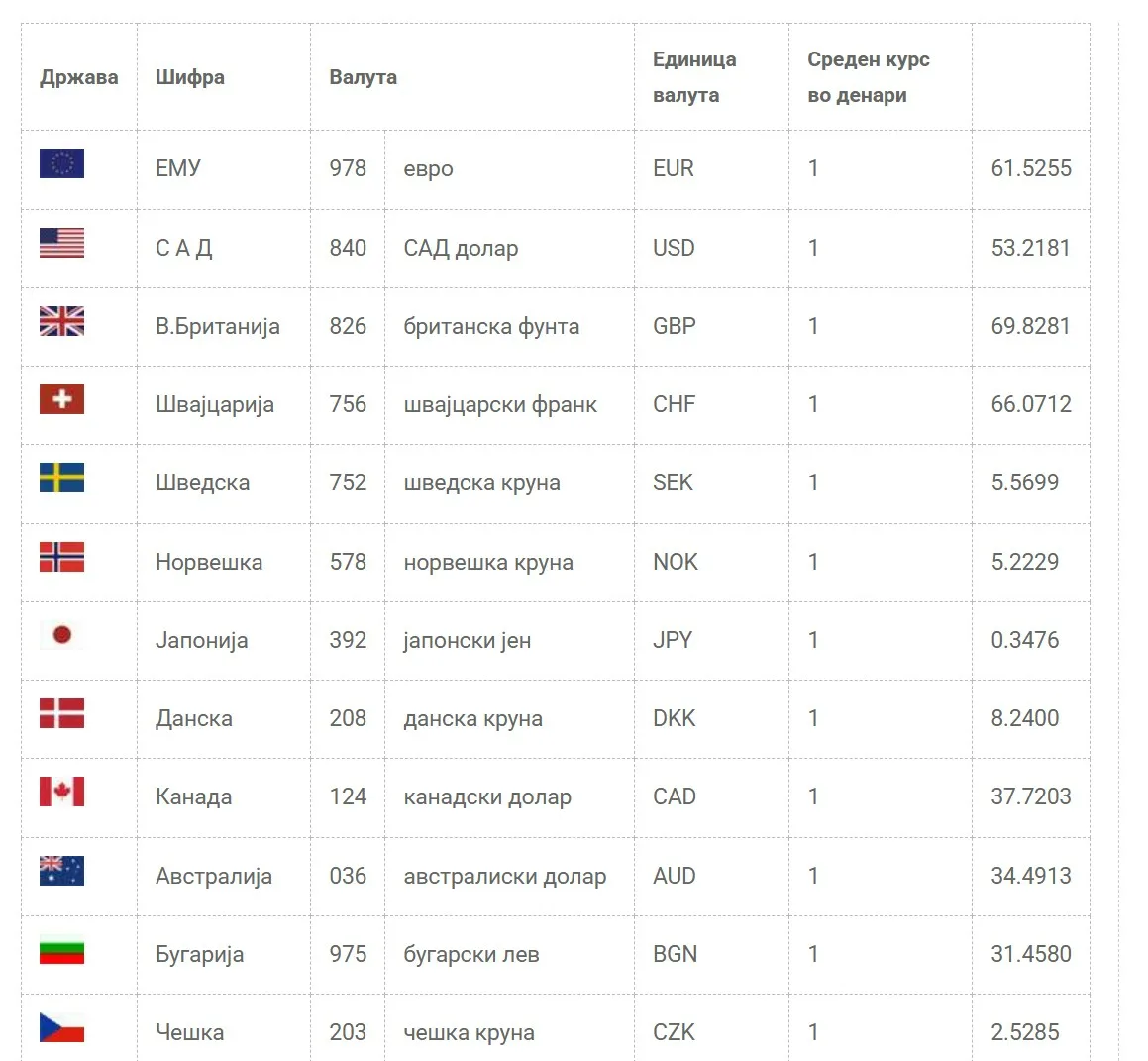 БИЗНИСКурсна листа за 10 ноември 2025 07:00, ноември 10, 202502:11, ноември 10, 2025 Курсна листа на Народната банка на Република Северна Македонија формирана на 07.11.2025 која се применува од 00:00 часот на 10.11.2025 година до почетокот на важење на новата Курсна листа: Оваа статија има 390 прегледи НАЈЧИТАНО СЕГА 7 ДЕНА 30 ДEНА