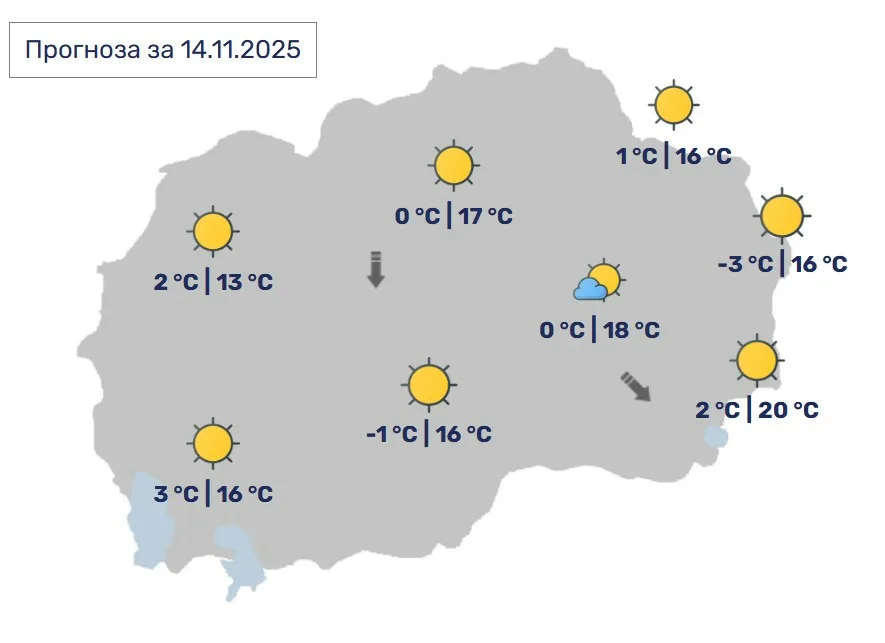 -МЕТЕОCENTARМАКЕДОНИЈАСиноптичарите ја објавија најновата прогноза за времето 11:50, ноември 14, 202511:51, ноември 14, 2025 Сончево со слаб ветер претежно од северен правец.Времето и метеоролошките параметри за Скопје: Сончево со слаб ветер од северен правец. НАЈЧИТАНО СЕГА 7 ДЕНА 30 ДEНА