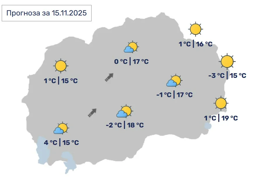 МЕТЕОCENTARМАКЕДОНИЈАСиноптичарите излегоа со прогноза – Какво време да очекуваме? 12:25, ноември 15, 2025 Сончево со мала до умерена локална облачност. Ќе дува слаб ветер претежно од југозападен правец.Времето и метеоролошките параметри за Скопје: Сончево и претежно тивко со мала до умерена облачност. НАЈЧИТАНО СЕГА 7 ДЕНА 30 ДEНА