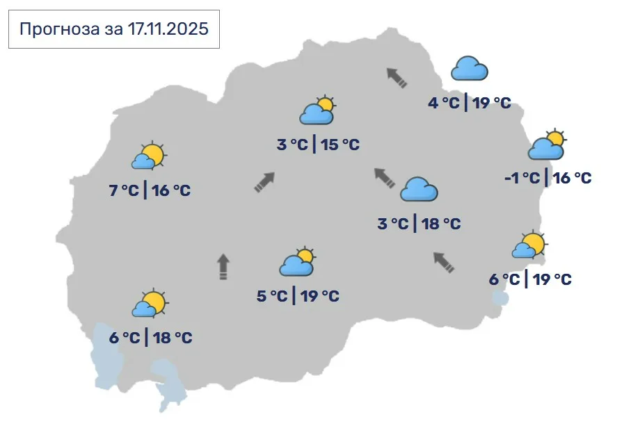 Во Скопје, наутро во делови од котлината ќе има услови за појава на слаба магла. Во текот на денот времето ќе биде претежно облачно. Ќе дува умерен до засилен јужен ветер.