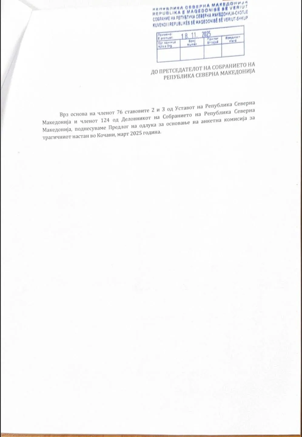 – Пратениците на СДСМ и Коалицијата, денеска поднесоа иницијатива за основање на Анкетна комисија за трагедијата во Кочани, на којашто се придружија и пратениците од Левица а беше дел и од барањата на семејствата на загинатите и повредените.