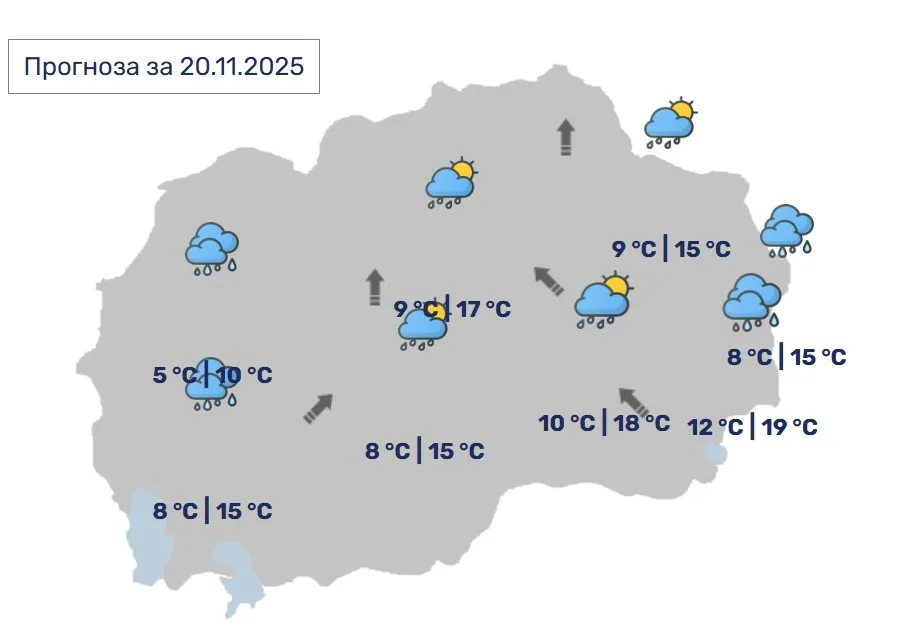 Во Скопје, променливо облачно со повремен дожд со послаб интензитет. Ќе дува слаб до умерен ветер од јужен правец.
