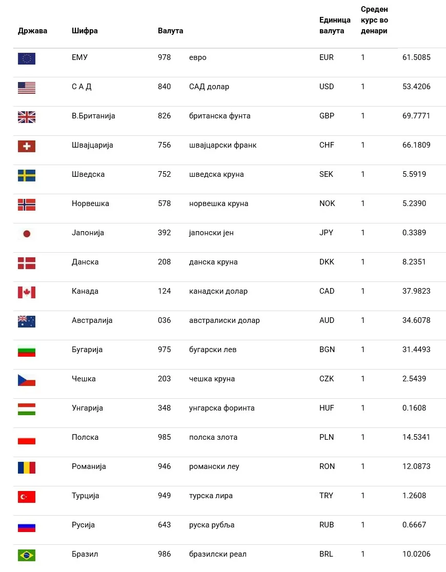 Курсна листа на Народната банка на Република Северна Македонија формирана на 20.11.2025 која се применува од 00:00 часот на 21.11.2025 година до почетокот на важење на новата Курсна листа: