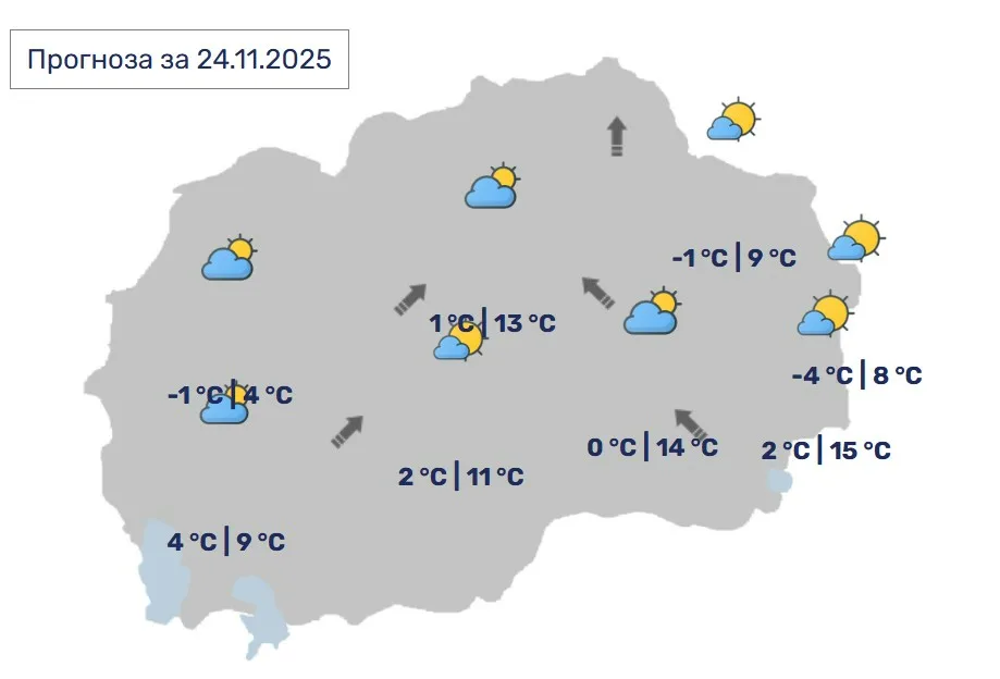 -МЕТЕОCENTARМАКЕДОНИЈАСиноптичарите излегоа со прогноза – Какво ќе биде времето? 11:25, ноември 24, 2025 Променливо облачно со сончеви периоди. Ќе дува слаб јужен, а во западните делови умерен ветер од југозападен правец. Во Скопје, променливо облачно со сончеви периоди. Ќе дува слаб ветер претежно од јужен правец. ПОПУЛАРНО НА ИНТЕРНЕТ... 1. Познато е кога ќе тргне исплатата на пензиите – некои од македонските банки тоа го прават предвреме 2. Наскоро исплата на средствата од Мој ДДВ – еве до кога треба да легнат парите на сметките на стотици илјади граѓани 3. СЛЕДУВА ЕДЕН ПРОДОЛЖЕН ВИКЕНД ЗА ОВАА ГОДИНА, А ВО 2026-ТА ДУРИ 7 – Објавена е листата на неработни денови за следната година 4. Декември ќе биде МАГИЧЕН за овие 4 знаци – пари им паѓаат од сите страни! 5. Просечната нето плата е 45.466 денари