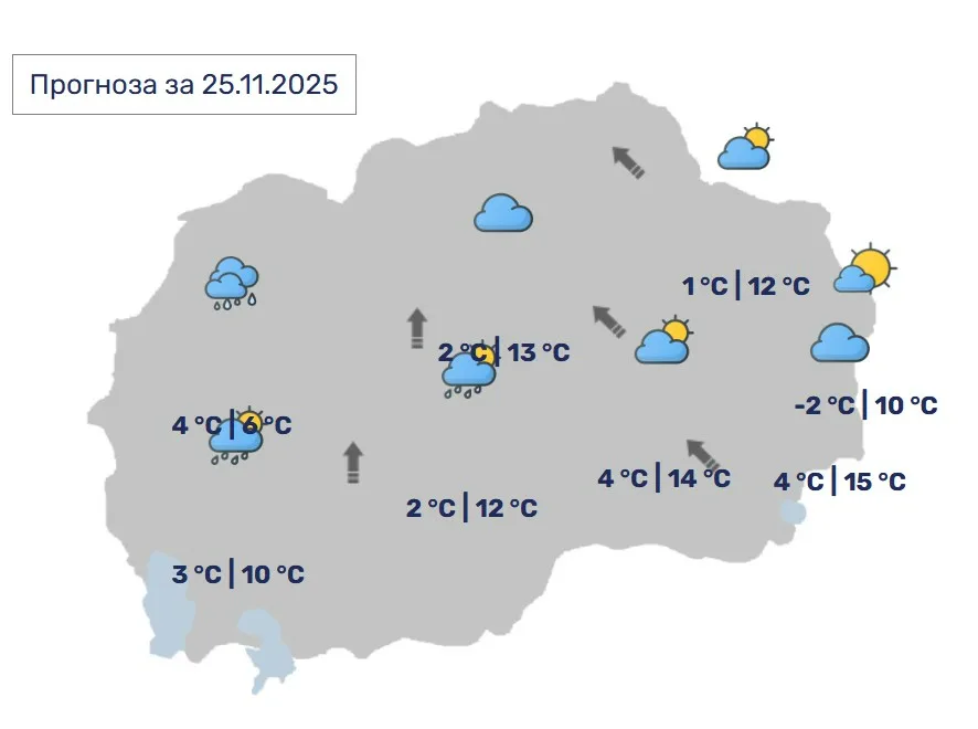 Времето и метеоролошките параметри за Скопје: Променливо облачно со кратки сончеви периоди. Ќе дува умерен, во делови од котлината повремено засилен ветер од југоисточен правец.
