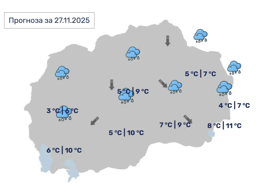 Во Скопје, претежно облачно со повремени врнежи од дожд. Ќе дува слаб до умерен северен ветер.