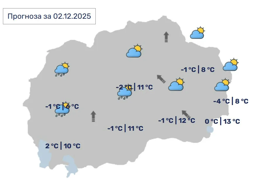 Променливо облачно и магловито. Кон крајот на денот и во текот на ноќта ќе има повремени локални врнежи од дожд. Ќе дува слаб до умерен ветер од југоисточен правец.
