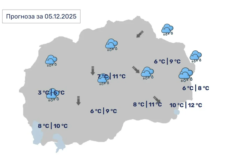 Облачно со врнежи од дожд, кои ќе бидат пообилни во јужните делови (локално над 40 l/m² за 24 часа). Ќе дува слаб до умерен ветер од северен правец.
