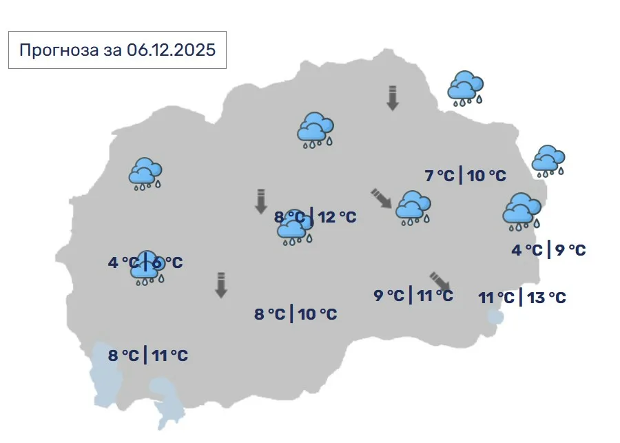 Претпладне облачно со повремен локален дожд, попладне облачноста ќе се намалува. Ќе дува слаб до умерен, наместа долж Повардарието и во источните делови повремено засилен ветер од северен правец.