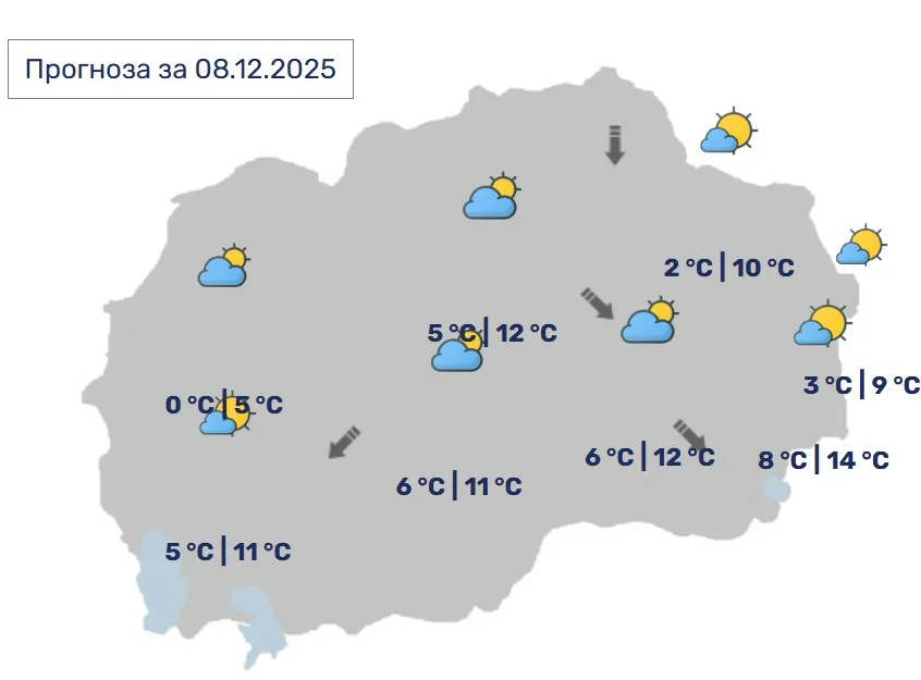 -МАКЕДОНИЈАСиноптичарите излегоа со прогноза – Какво време да очекуваме? 13:23, декември 8, 2025 Променливо облачно со сончеви периоди. Ќе дува слаб, a долж Повардарието умерен ветер од северен правец. Времето и метеоролошките параметри за Скопје: Во Скопје, променливо облачно со сончеви периоди. Ќе дува слаб ветер од северен правец.