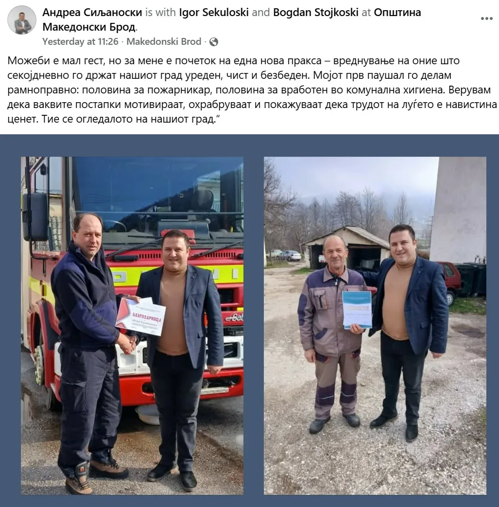 – Можеби е мал гест, но за мене е почеток на една нова пракса – вреднување на оние што секојдневно го држат нашиот град уреден, чист и безбеден. Мојот прв паушал го делам рамноправно: половина за пожарникар, половина за вработен во комунална хигиена. Верувам дека ваквите постапки мотивираат, охрабруваат и покажуваат дека трудот на луѓето е навистина ценет. Тие се огледалото на нашиот град.“, напиша Сиљјаноски