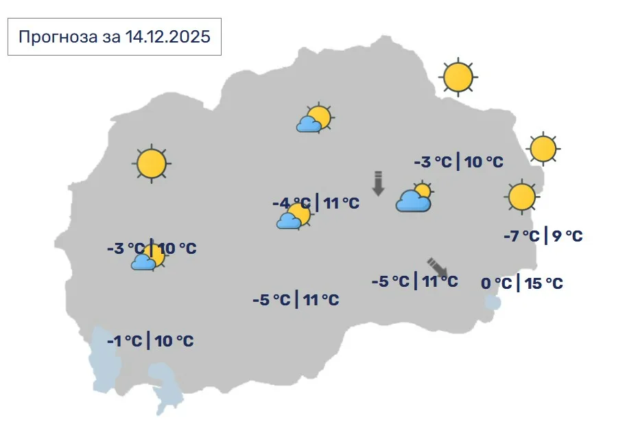 Претпладне и во вечерните часови во делови од котлината ќе има појава на магла. Во текот на денот времето ќе биде сончево со мала до умерена облачност. Ќе дува слаб северозападен ветер.