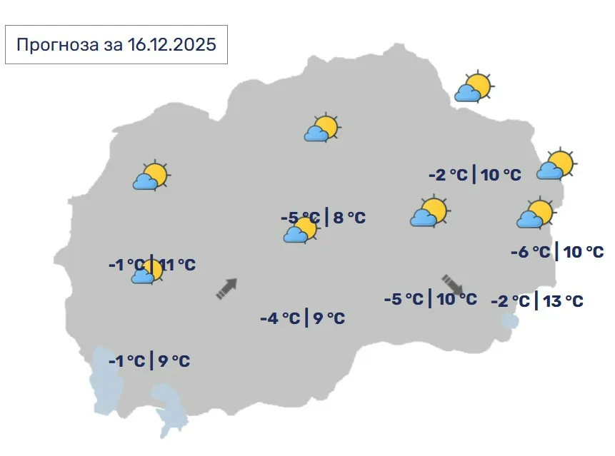 Во Скопје, претпладне во делови од котлината ќе има појава на магла. Во текот на денот времето ќе биде сончево со мала до умерена облачност и претежно тивко.