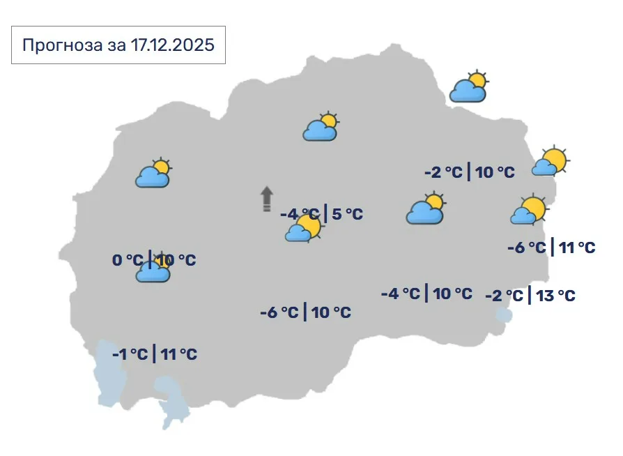 -МЕТЕОCENTARМАКЕДОНИЈАСиноптичарите излегоа со прогноза – Какво ќе биде времето? 10:51, декември 17, 2025 Променливо облачно со сончеви периоди и претежно тивко. Претпладне по одделни котлини ќе има појава на магла. Во Скопје, променливо облачно и претежно тивко. Претпладне во делови од котлината ќе има појава на магла.