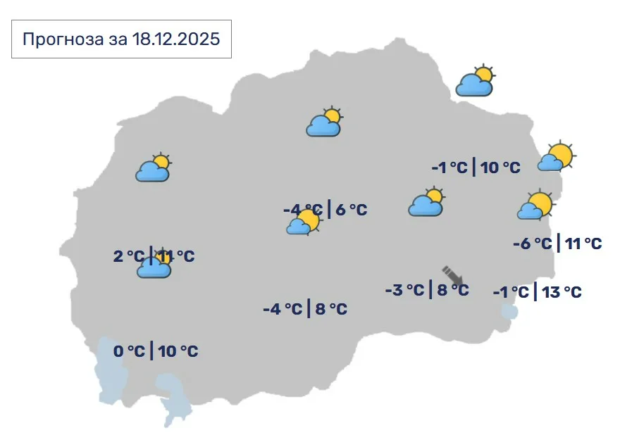 Времето и метеоролошките параметри за Скопје: Променливо облачно и претежно тивко. Во делови од котлината ќе има појава на магла.