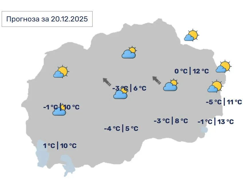 МЕТЕОCENTARМАКЕДОНИЈАСиноптичарите излегоа со прогноза – Какво време да очекуваме? 13:01, декември 20, 2025 Променливо облачно со сончеви периоди. Претпладне по одделни котлини ќе има појава на магла. Ќе дува слаб ветер од југоисточен правец. Времето и метеоролошките параметри за Скопје: Променливо облачно и тивко со појава на магла.