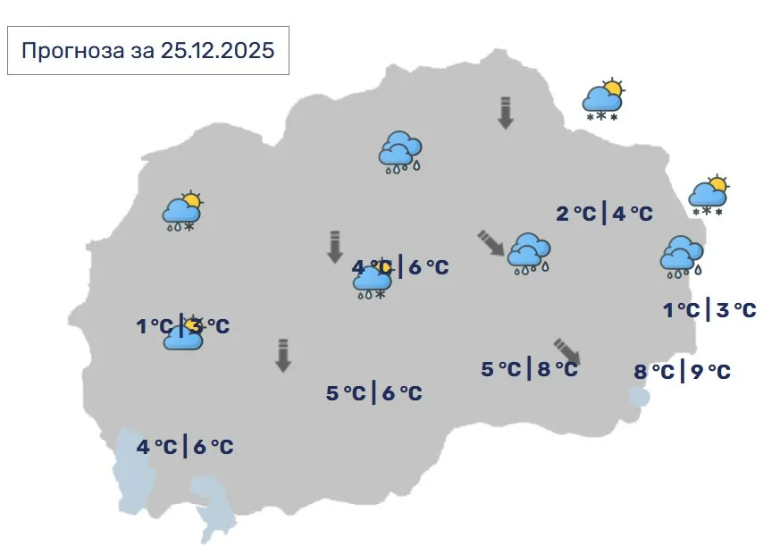 Променливо облачно со повремени локални врнежи од дожд, особено во источните делови. На планините и на некои од повисоките места врнежите ќе бидат од снег. Попладне врнежите насекаде ќе престанат. Ќе дува слаб до умерен ветер од северен правец.