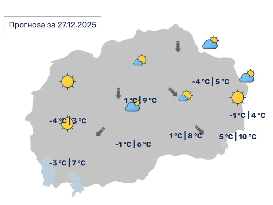 Времето и метеоролошките параметри за Скопје: Сончево со мала облачност. Ќе дува умерен, во делови од котлината повремено засилен северен ветер.