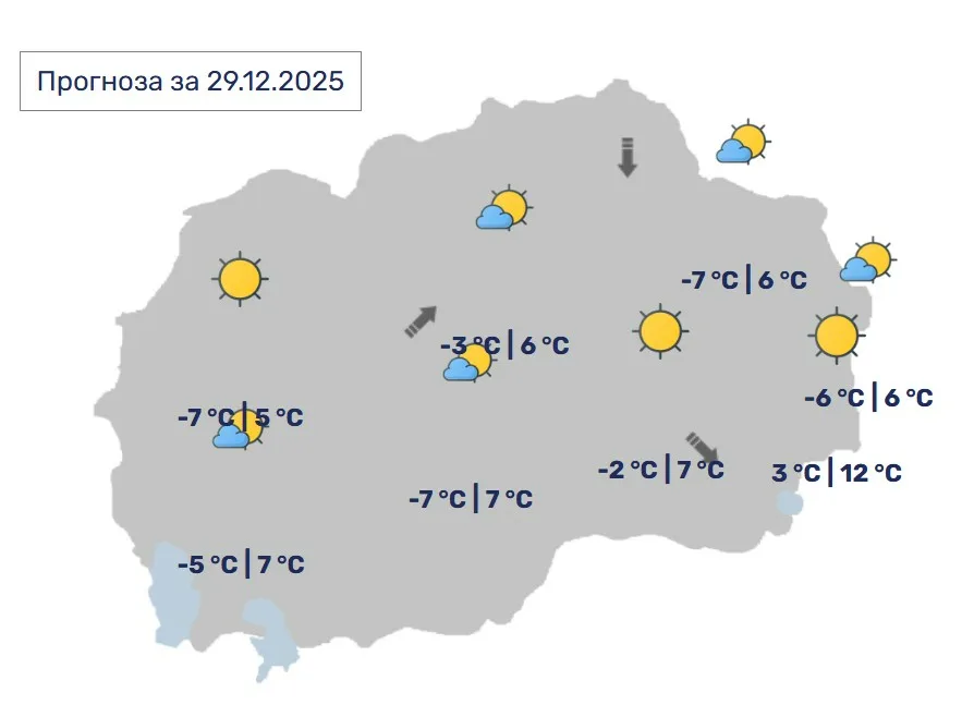МЕТЕОCENTARМАКЕДОНИЈАСиноптичарите излегоа со прогноза – Какво време да очекуваме? 10:42, декември 29, 2025 Утрото ведро и многу студено, преку денот сончево со мала до умерена облачност. Ќе дува слаб до умерен ветер од северен правец. Во Скопје, сончево со мала облачност. Ќе дува слаб до умерен ветер од северен правец.