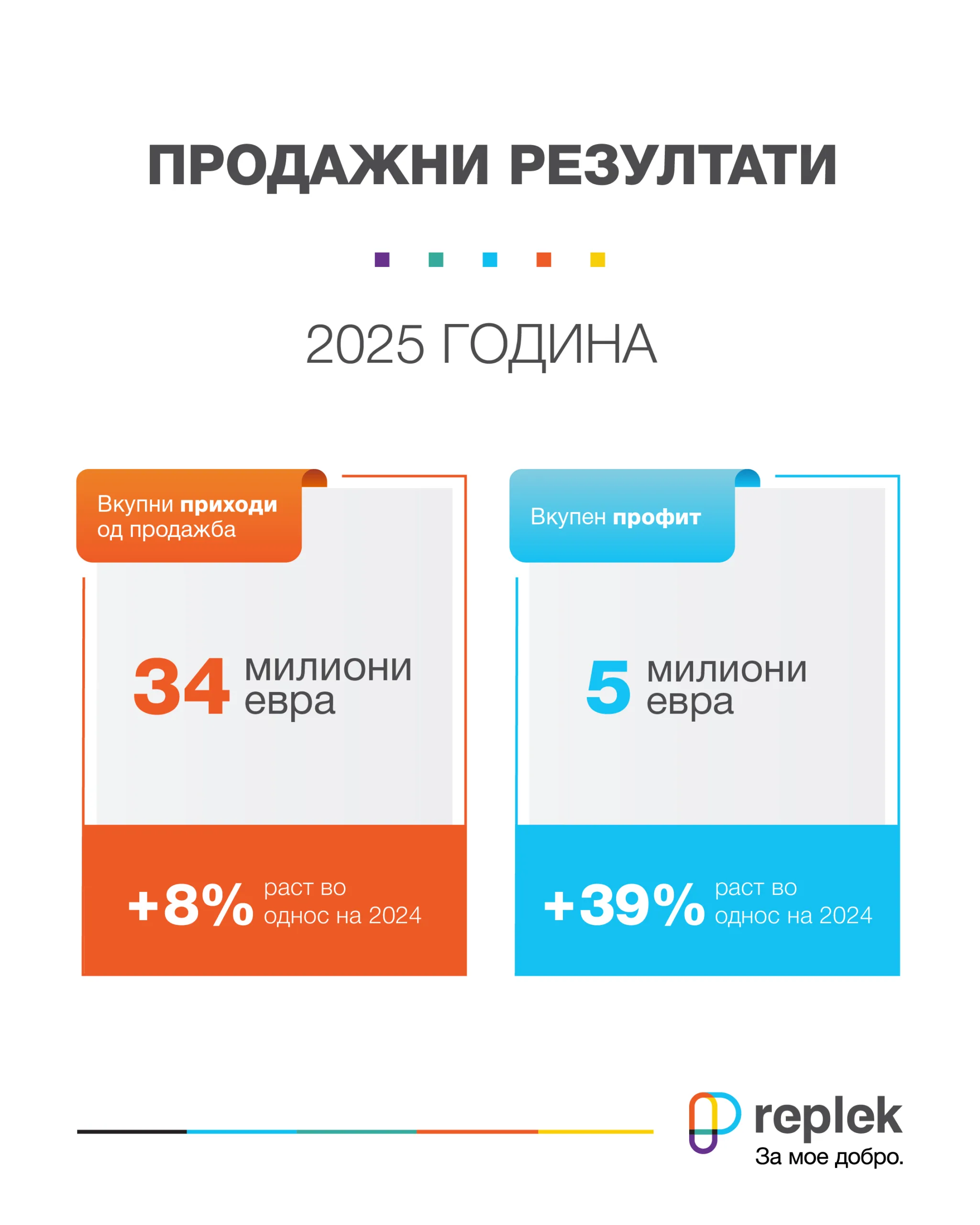 Вкупните приходите од продажбите на „Реплек“ во периодот од 1 јануари заклучно со 31 декември 2025 година изнесуваат 34 милиони евра, што претставува раст од 8% во споредбата со 2024 година, и е доказ за континуираната динамика на раст и стабилното пазарно присуство на компанијата. Од продажбата на домашниот пазар „Реплек“ реализираше приходи од 8,6 милиони евра, задржувајќи силна позиција и континуирано присуство во клучните сегменти. Преку извозните активности, пак, компанијата оствари приходи од 25,4 милиони евра, потврдувајќи ги своите позиции на странските пазари.