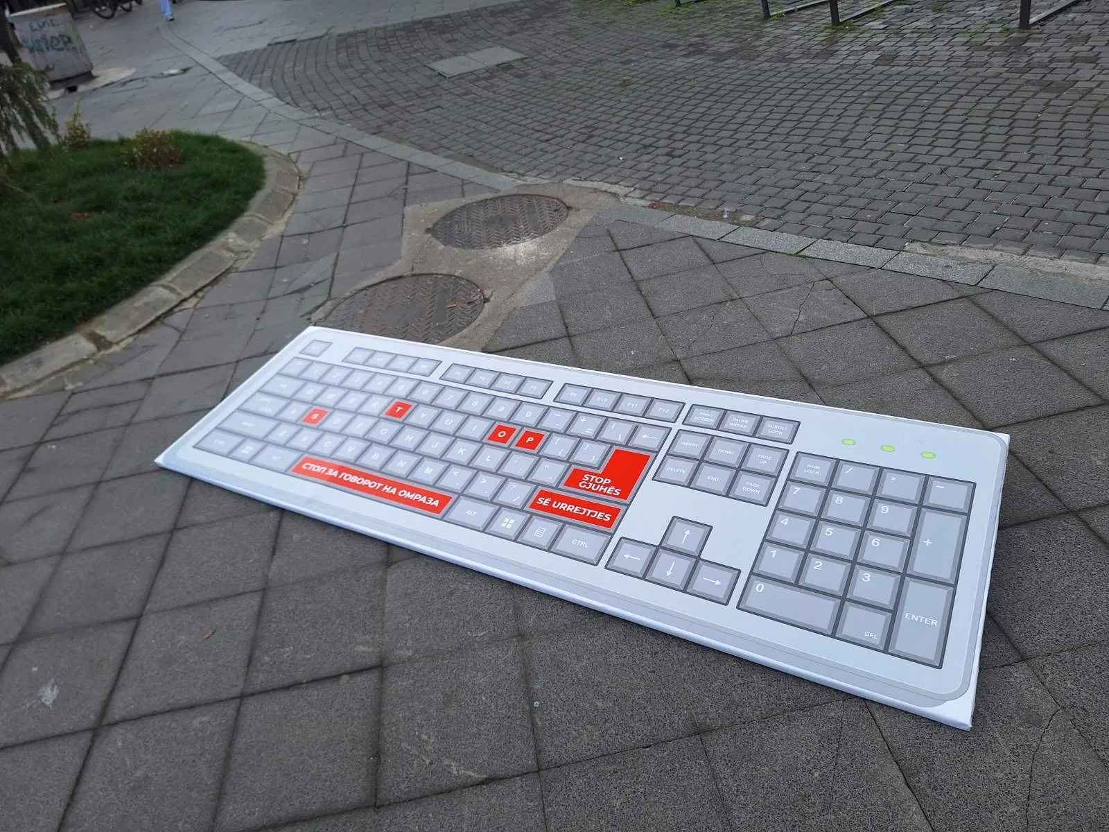 На скверчето кај КИМ, на булевар „Партизански одреди“ во Скопје, денеска e поставена уметничка интервенција во форма на голема скулптурална тастатура, која ја пренесува пораката „Стоп за говорот на омраза“.